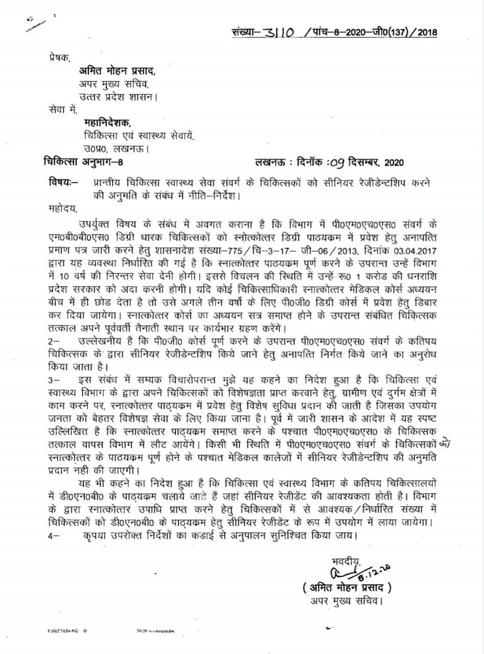 उत्तर प्रदेश की सरकार ने डॉक्टरों को लेकर बड़ा फैसला लिया है स्वास्थ्य विभाग के प्रमुख सचिव के मुताबिक आदेश में साफ कहा गया है कि पीजी करने के बाद डॉक्टरों को कम से कम 10 साल तक सरकारी अस्पताल में सेवा देनी होगी।