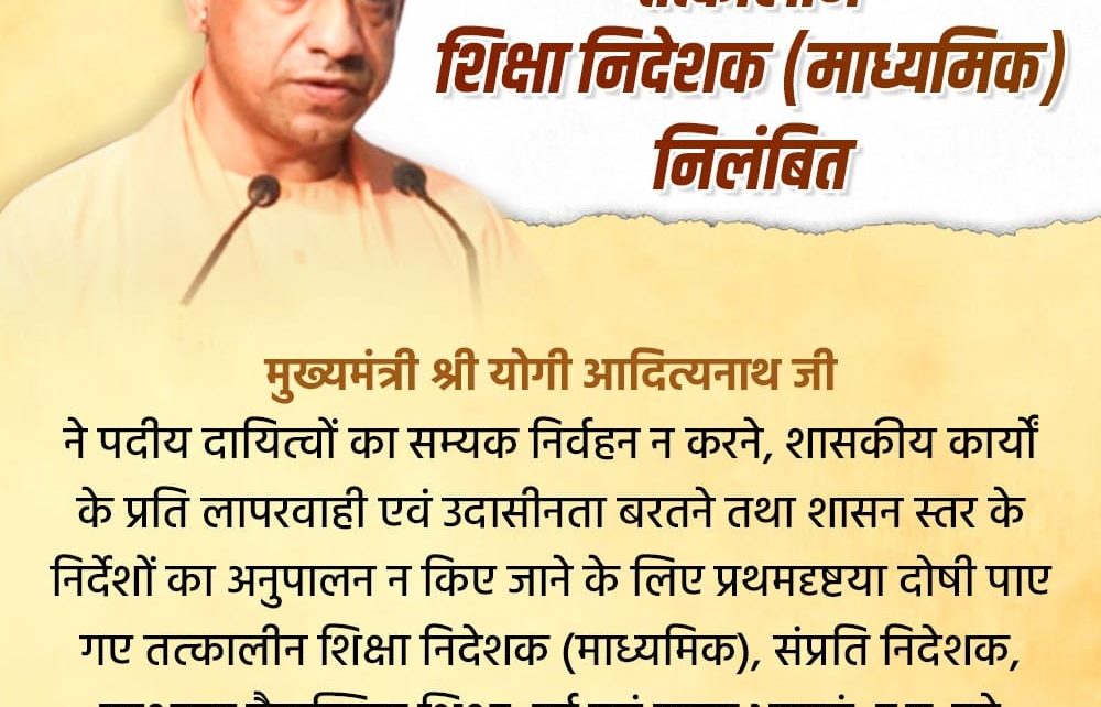 लखनऊ : मुख्यमंत्री योगी ने तत्कालीन शिक्षा निदेशक (माध्यमिक) विनय पांडये को निलंबित करने का आदेश दिया है, जो आधिकारिक कर्तव्यों का ठीक से निर्वहन नहीं करने, सरकारी कार्यों के प्रति लापरवाही और उदासीनता और सरकारी स्तर के निर्देशों का पालन न करने के लिए प्रथम दृष्टया दोषी मिले हैं।विनय पांडे को 21 अप्रैल को माध्यमिक शिक्षा निदेशक के पद से हटा दिया गया था और उन्हें साक्षरता वैकल्पिक शिक्षा, उर्दू और प्राच्य भाषाओं के निदेशक के रूप में तैनात किया गया था। पिछले महीने बलिया में प्रश्नपत्र लीक होने के बाद 24 जिलों में उत्तर प्रदेश माध्यमिक विद्यालय बोर्ड की परीक्षा रद्द कर दी गई थी। मुख्यमंत्री आदित्यनाथ ने मामले में कड़े राष्ट्रीय सुरक्षा कानून को लागू करने का आदेश दिया था। रद्द की गई परीक्षा 13 अप्रैल को फिर से आयोजित की गई थी। मुख्यमंत्री कार्यालय के एक ट्वीट में कहा गया, “मुख्यमंत्री योगी आदित्यनाथ द्वारा आधिकारिक कर्तव्यों के निर्वहन में लापरवाही पर एक और सख्त कार्रवाई। तत्कालीन शिक्षा निदेशक (माध्यमिक) को निलंबित कर दिया गया।”