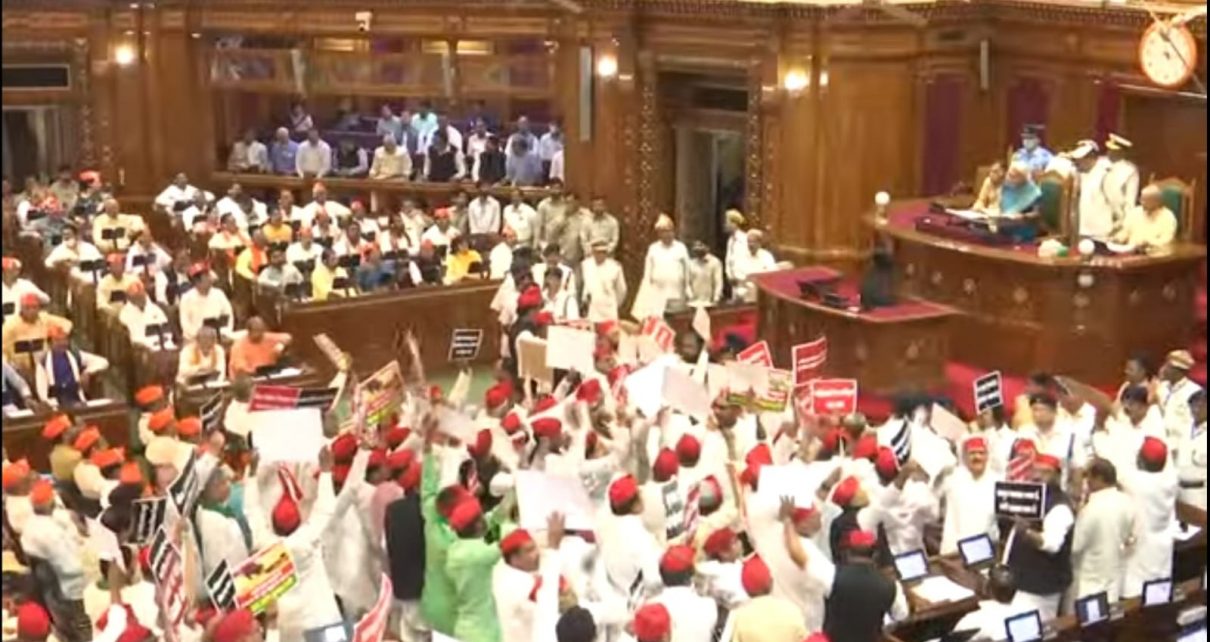 लखनऊ : उत्तर प्रदेश विधानमंडल के बजट सत्र के पहले ही दिन विधानसभा के मंडप में समवेत सदन में राज्यपाल आनंदीबेन पटेल का अभिभाषण शुरू होते ही हंगामा होने लगा। पूर्व मुख्यमंत्री अखिलेश यादव की मौजूदगी में समाजवादी पार्टी के विधायक तथा विधान परिषद सदस्य हाथों में सरकार के विरोध में नारे लिखकर हंगामा करने लगे। इस दौरान भी राज्यपाल ने अपना भाषण जारी रखा ।विधान सभा मंडप में समवेत सदन में राज्यपाल आनंदीबेन का अभिभाषण शुरू होते ही समाजवादी पार्टी के सदस्य हाथों में सरकार विरोधी नारे लिखी तख्तियां लेकर नारेबाजी तथा हंगामा करने लगे। यह लोग वेल में आ गए और नारा लगाने लगे। राज्यपाल वापस जाओ के नारे लगने के बीच में भी राज्यपाल आनंदीबेन का भाषण जारी रहा । नेता विरोधी दल अखिलेश यादव भी खड़े होकर अपनी पार्टी के विधायकों का हंगामा देख रहे थे। सदन में समाजवादी पार्टी के साथ ही राष्ट्रीय लोकदल के विधायक भी काफी हंगामा किया । सदन में यह लोग अभिभाषण के दौरान राज्यपाल वापस जाओ के नारे लगा रहेथे । सपा तथा आरएलडी विधायक वेल में प्रदर्शन किया । यह सभी महंगाई, कानून व्यवस्था भ्रष्टाचार पर सरकार को घेर रहे हैं।