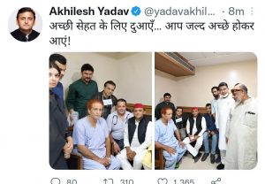 नई दिल्ली : समाजवादी पार्टी के मुखिया अखिलेश यादव ने आज दिल्ली के सर गंगा राम अस्पताल में सपा से नाराज चल रहे विधायक आजम खां से मुलाकात की। इस मुलाकात की जानकारी अखिलेश यादव ने ट्वीट कर दी। अखिलेश ने मुलाकात के बाद लिखा कि अच्छी सेहत के लिए दुआएं आप जल्द अच्छे होकर आएं!