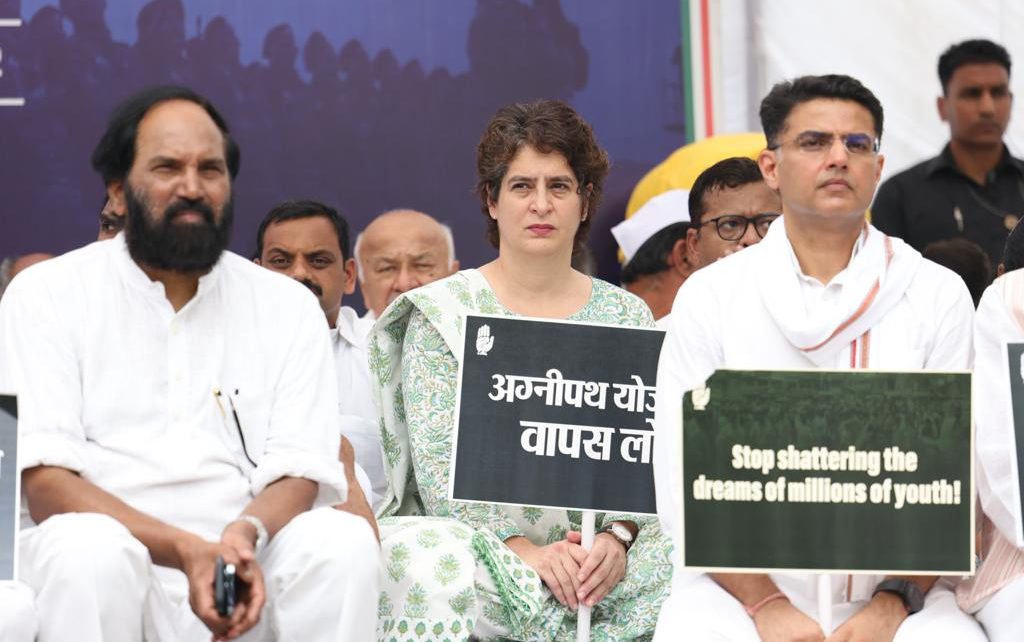 नई दिल्ली : उत्तर प्रदेश कांग्रेस प्रभारी प्रियंका गांधी वाड्रा ने वरिष्ठ कांग्रेस नेताओं के साथ केंद्र सरकार द्वारा सेना भर्ती की लायी गयी “अग्निपथ भर्ती योजना“ का विरोध कर रहे युवाओं के समर्थन में आज नई दिल्ली स्थित जंतर मंतर में “सत्याग्रह आंदोलन“ के माध्यम से अपना विरोध प्रदर्शन दर्ज किया।