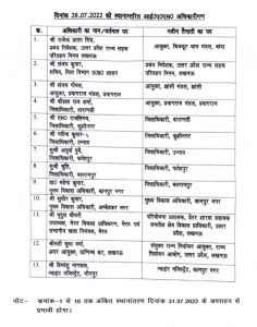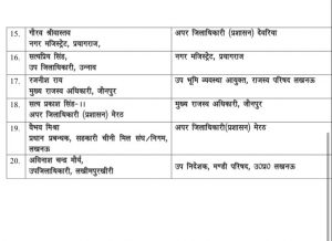 इसके अलावा सुधीर कुमार को कानपुर नगर का सीडीओ, मृदुल चौधरी को परियोजना निदेशक-ग्रेटर शारदा सहायक समादेश क्षेत्र विकास प्राधिकारी की जिम्मेदारी दी गई है। सुधा वर्मा को संयुक्त राज्य निर्वाचन आयुक्त, हिमांशु नागपाल को ज्वाइंट मजिस्ट्रेट कानपुर नगर बनाया गया है। पूजा अग्निहोत्री को उप निदेशक पर्यटन निदेशालय, गौरव शुक्ला को उपनिदेशक बाल विकास पुष्टाहार निदेशालय, नंदलाल सिंह को संयुक्त ग्राम्य विकास बनाया गया है।