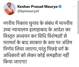 हाईकोर्ट का फैसला आने के बाद प्रदेश के डिप्टी सीएम केशव प्रसाद मौर्य ने कहा कि पिछड़े वर्ग के अधिकारों को लेकर कोई समझौता नहीं किया जाएगा। वहीं अपना दल ने कहा कि OBC वर्ग के बिना निकाय चुनाव किसी भी दृष्टि से उचित नहीं है।प्रदेश के डिप्टी सीएम केशव प्रसाद मौर्य ने नगरीय निकाय चुनाव पर हाईकोर्ट का फैसला आने के बाद फौरन ट्वीट कर कहा कि नगरीय निकाय चुनाव के संबंध में माननीय उच्च न्यायालय इलाहाबाद के आदेश का विस्तृत अध्ययन कर विधि विशेषज्ञों से परामर्श के बाद सरकार के स्तर पर अंतिम निर्णय लिया जाएगा,परंतु पिछड़े वर्ग के अधिकारों को लेकर कोई समझौता नहीं किया जाएगा!
