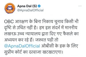 अपना दल ने भी नगरीय निकाय चुनाव पर हाईकोर्ट का फैसला आने के बाद ट्वीट कर कहा कि OBC आरक्षण के बिना निकाय चुनाव किसी भी दृष्टि से उचित नहीं है। हम इस संदर्भ में माननीय लखनऊ उच्च न्यायालय द्वारा दिए गए फैसले का अध्ययन कर रहे हैं। जरूरत पड़ी तो अपना दल ओबीसी के हक के लिए सुप्रीम कोर्ट का दरवाजा खटखटाएगा।