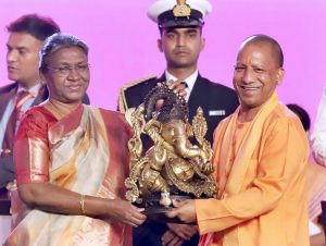 उत्तर प्रदेश के मुख्यमंत्री योगी आदित्यनाथ जी ने राष्ट्रपति श्रीमती द्रौपदी मुर्मु जी का देश के हृदय स्थल उत्तर प्रदेश के निवेश महाकुम्भ में स्वागत करते हुए कहा कि यह हम सबका सौभाग्य है कि यू0पी0 ग्लोबल इन्वेस्टर्स समिट-2023 में विगत 10 फरवरी, 2023 को प्रधानमंत्री श्री नरेन्द्र मोदी जी की उपस्थिति ने एक नयी ऊँचाई प्रदान की है। प्रधानमंत्री जी के नेतृत्व में विगत 09 वर्षाें में पूरी दुनिया में देश का जो सम्मान बढ़ा है, उसका लाभ हमें यू0पी0 ग्लोबल इन्वेस्टर्स समिट-2023 के भव्य आयोजन में दिखायी दिया है। इस समिट में वैश्विक व्यापारी समुदाय निवेश के सबसे अच्छे गंतव्य के रूप में उत्तर प्रदेश की तरफ आकर्षित होता दिखायी दिया है।