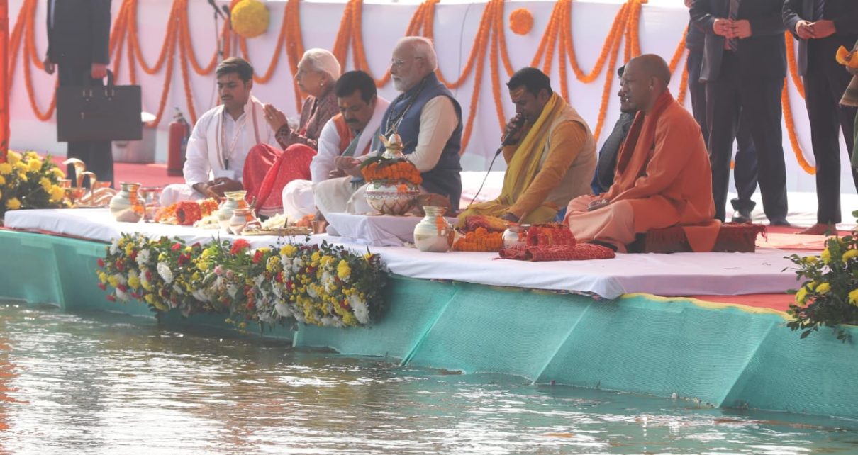 यहां से पीएम सीधे संगम नोज पर बने पंडाल में पहुंचे। यहां उपस्थित तीर्थ पुरोहितों ने उन्हें आसन ग्रहण कराया। पीएम के अगल-बगल में सीएम योगी और राज्यपाल आनंदीबेन पटेल ने भी आसन ग्रहण किया। इसके बाद तीर्थ पुरोहितों के वैदिक मंत्रोच्चारण के बीच पीएम मोदी ने पूजा अर्चना की। तीर्थ पुरोहितों ने उनसे आचमन भी कराया। पीएम मोदी ने खड़े होकर त्रिवेणी का जलाभिषेक और दुग्धाभिषेक किया। पीएम मोदी, सीएम योगी और राज्यपाल ने अक्षत, चंदन, रोली और पुष्पमाला के साथ ही त्रिवेणी में वस्त्र भी अर्पित किया। इसके बाद पीएम ने संगम आरती भी की। अंत में पीएम मोदी ने विशेष रूप से सजाए गए प्रांगण में फोटोशूट भी कराया।