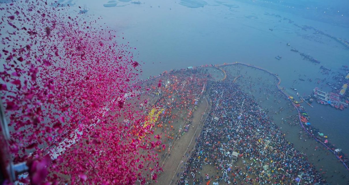 महाकुम्भनगर ( DNM DIGITAL): महाकुम्भ 2025 के अंतिम अमृत स्नान बसंत पंचमी के दिन सोमवार को संगम तट पर डुबकी लगाने पहुंचे करोड़ों श्रद्धालुओं पर योगी सरकार ने हेलीकॉप्टर से पुष्प वर्षा कराई। हेलीकॉप्टर से सभी घाटों और अखाड़ों पर स्नान के दौरान श्रद्धालुओं पर फूलों की बारिश की गई। पुष्प वर्षा की शुरुआत सुबह 6.30 बजे से ही हो गई, जब अखाड़ों का अमृत स्नान जारी था। गुलाब की पंखुड़ियों की बारिश देख संगम तट पर मौजूद नागा संन्यासियों, संतों और श्रद्धालुओं ने अभिभूत होकर जय श्री राम और हर हर महादेव के नारे लगाए।