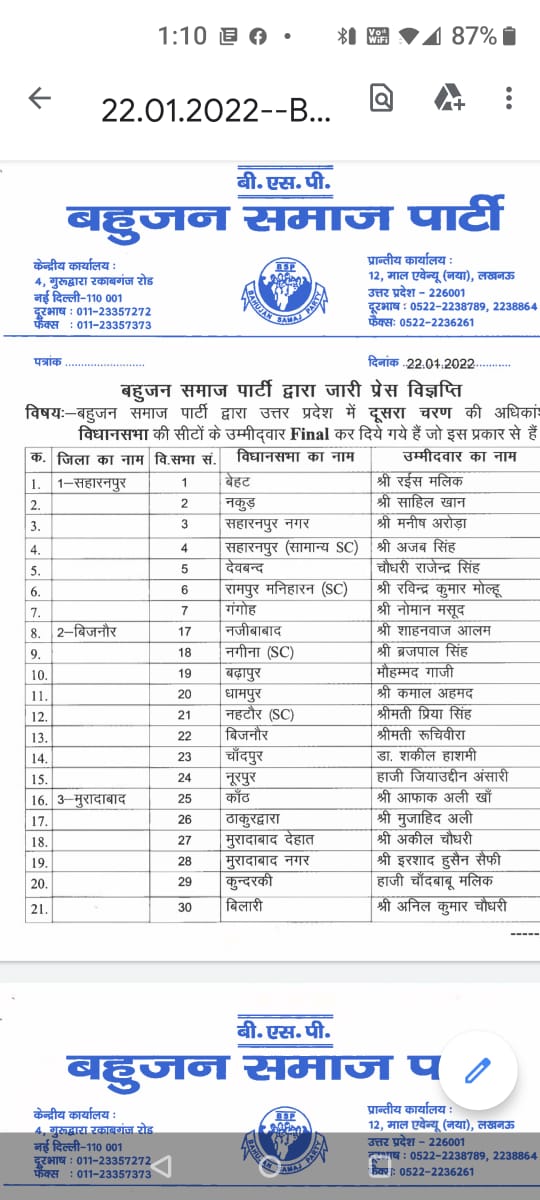 लखनऊ: शनिवार को लखनऊ में बीएसपी सुप्रीमों मायावती ने दूसरे चरण के उम्मीदवारो की सूची जारी की, 55 सीटो में 51 सीटो पर बीएसपी ने प्रत्याशियो की सूची जारी की,मायावती ने हर पोलिंग बूथ को जिताना है बीएसपी को सत्ता में लाना है का नया नारा दिया है।