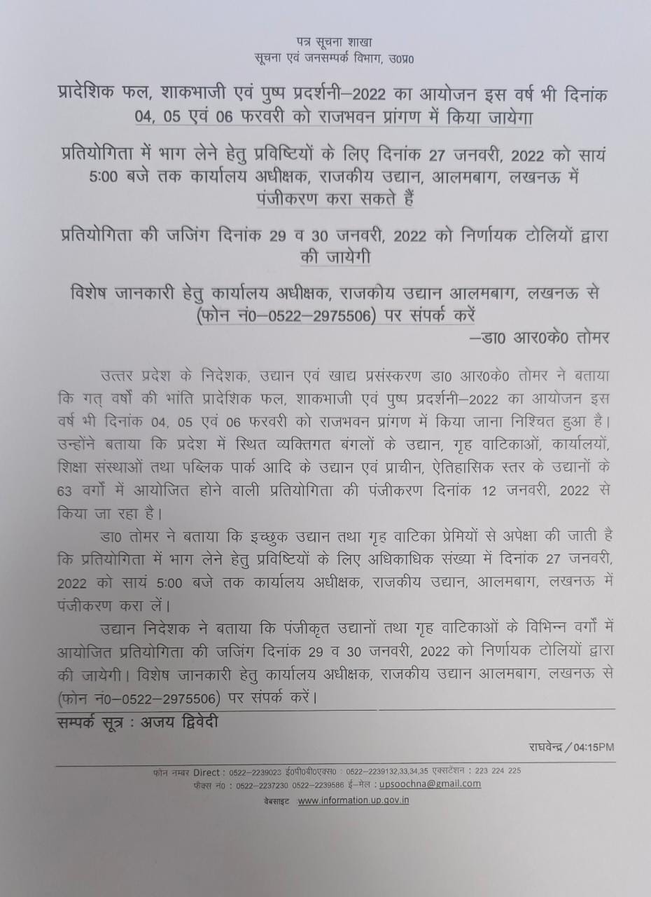 लखनऊ: उत्तर प्रदेश के निदेशक,उद्यान एवं खाद्य प्रसंस्करण डा0 आर.के तोमर ने बताया कि गत वर्षो की भांति प्रादेशिक फल,शाकभाजी एवं पुष्प प्रदर्शनी 2022 का आयोजन पिछले वर्षे की भांति इस साल भी दिनांक 04 से 6 फरवरी तक राजभवन प्रांगण में किया जाएगा,उन्होने बताया कि प्रदेश में स्थित व्यक्तिगत बंगलो के उद्यान,गृह वाटिकाओ ,कार्यालयों,शिक्षा संस्थाओं तथा पब्लिक पार्क आदि के उद्यान एवं प्राचीन,ऐतिहासिक स्तर के उद्यानों के 63 वर्गो में आयोजित होने वाली प्रतियोगिता का पंजीकरण 27 जनवरी तक किया जा चुका है। प्रतियोगिता की जजिंग 29 और 30 जनवरी को निर्णायक टोलियो द्वारा की जायेगी।