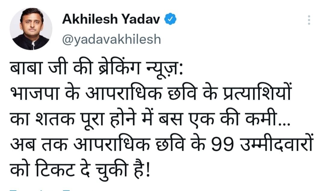 सपा अध्यक्ष अखिलेश यादव ने भाजपा द्वारा 99 आपराधिक छवि के उम्मीदवारों को टिकट देने पर मुख्यमंत्री योगी आदित्यनाथ पर निशाना साधा है।यूपी में विधानसभा चुनाव के लिए 10 फरवरी को पहले चरण का मतदान होगा। इसे लेकर नेताओं के बीच बयानबाजी बहुत तल्ख हो गई है। मुख्यमंत्री योगी आदित्यनाथ द्वारा सपा अध्यक्ष अखिलेश यादव को तमंचावादी कहने पर अखिलेश यादव ने पलटवार किया है।उन्होंने रविवार को ट्वीट कर कहा कि भाजपा के आपराधिक छवि के प्रत्याशियों का शतक पूरा होने में बस एक की कमी… अब तक आपराधिक छवि के 99 उम्मीदवारों को टिकट दे चुकी है!