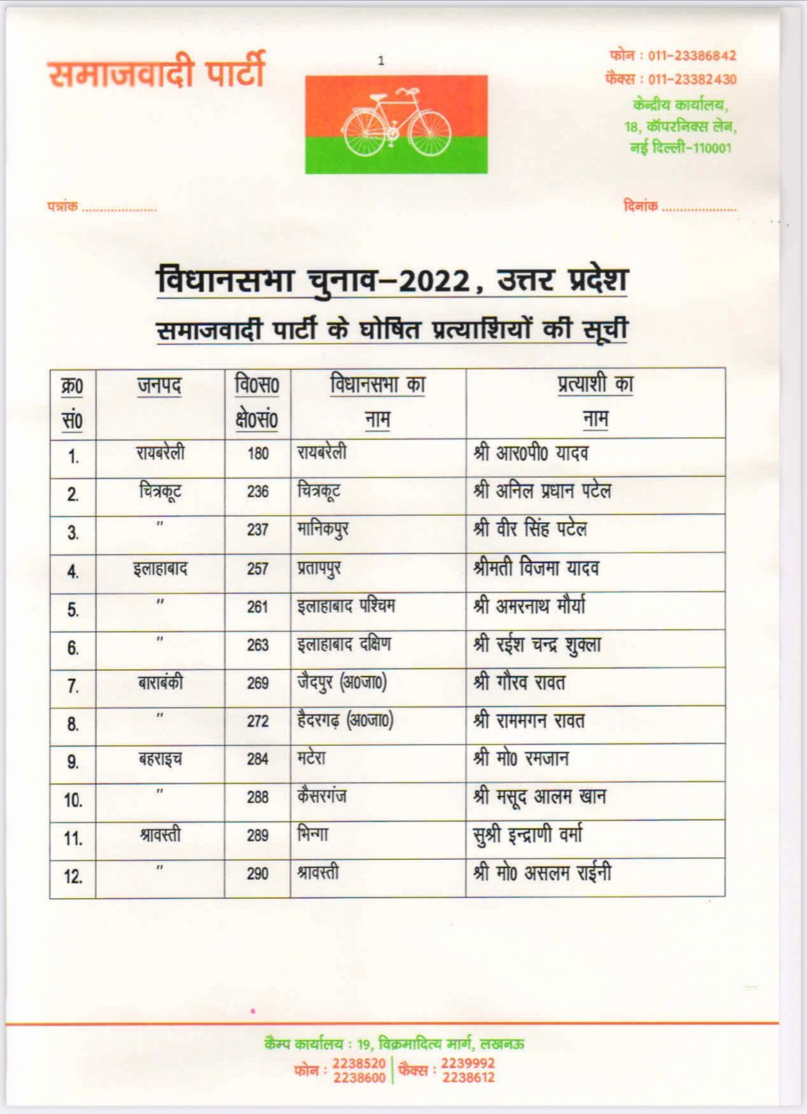 इसी प्रकार प्रयागराज की प्रतापपुर सीट से विजमा यादव, प्रयागराज की इलाबाद पश्चिम सीट से अमरनाथ मौर्या और प्रयागराज की इलाहाबाद दक्षिण सीट से रईश चंद्र शुक्ला को टिकट दिया गया है। बाराबंकी की जैदपुर (सुरक्षित) सीट से गौरव रावत और बाराबंकी की ही हैदरगढ़ (सुरक्षित) सीट से राममगन रावत को उम्मीदवार बनाया गया है। बहराइच जिले की मटेरा सीट से मो. रमजान और कैसरगंज से मसूद आलम खान को चुनाव मैदान में उतारा गया है। श्रावस्ती की भिनगा सीट से इंद्राणी वर्मा और श्रावस्ती सीट से मो. असलम राइनी को उम्मीदवार घोषित किया गया है।