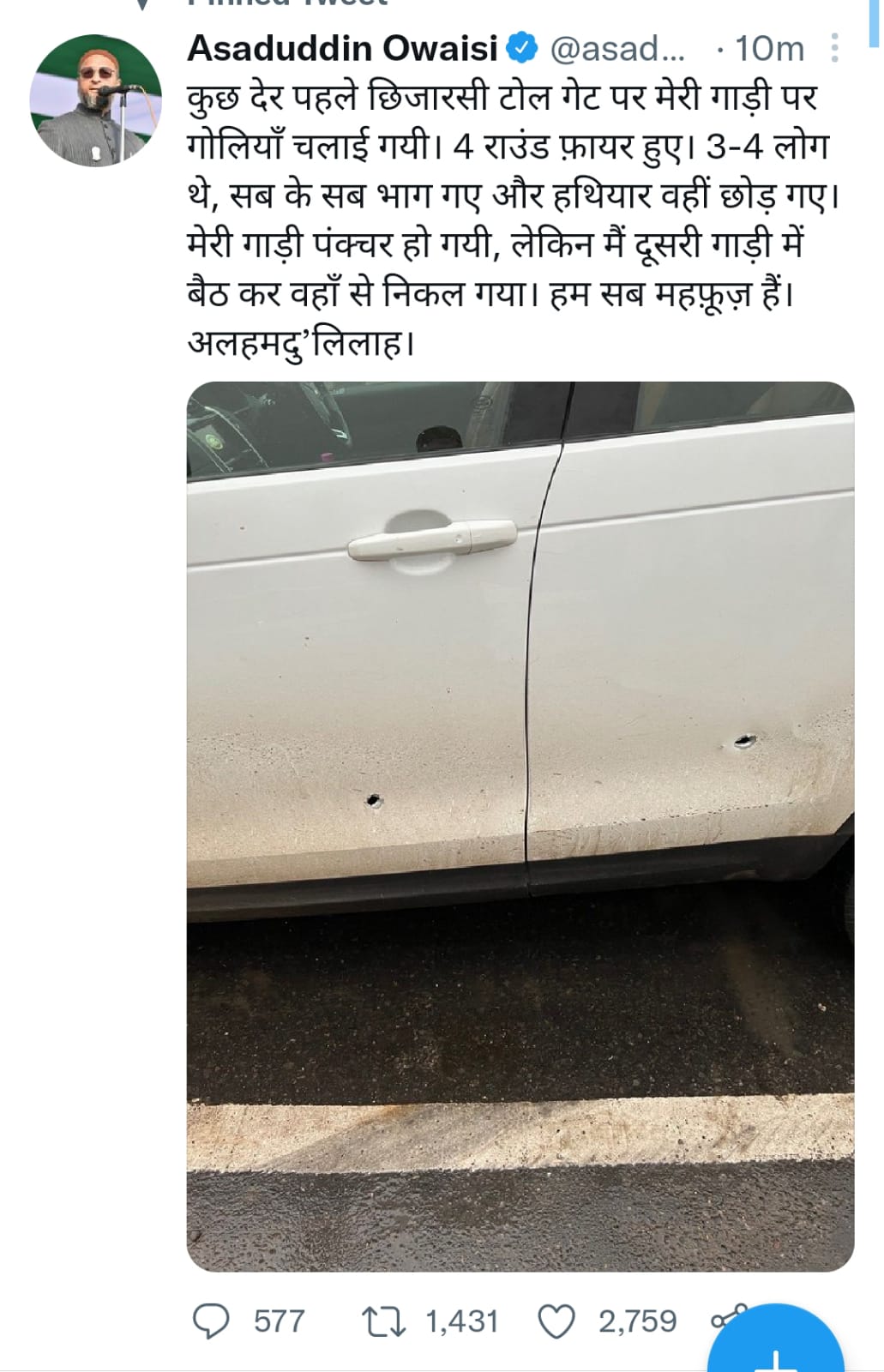 हापुड़ : एआईएमआईएम प्रमुख असदुद्दीन ओवैसी ने चुनाव प्रचार के दौरान खुद पर हमला होने का दावा किया है। उन्होंने कहा कि मैं किठौर, मेरठ में एक चुनावी कार्यक्रम के बाद दिल्ली जा रहा था। छिजारसी टोल प्लाजा के पास दो लोगों ने मेरी गाड़ी पर तीन-चार राउंड गोलियां चलाईं; वे कुल तीन-चार लोग थे। मेरी गाड़ी के टायर पंक्चर हो गए, मैं दूसरी गाड़ी में वहां से निकला।कार पर गोलीबारी की सूचना मिलते ही मौके पर पुलिस का जत्था पहुंचा है. आईजी मेरठ के मुताबिक, टोल प्लाजा पर ओवैसी समर्थकों के साथ कहासुनी की जानकारी हुई है लेकिन फ़िलहाल गोली चलने की कोई बात सामने नहीं आयी है. जो दावा किया जा रहा है उसको लेकर हम सीसीटीवी कैमरों की जांच कर रहे हैं. जांच के बाद ही दावों पर सच्चाई का पता लगेगा.