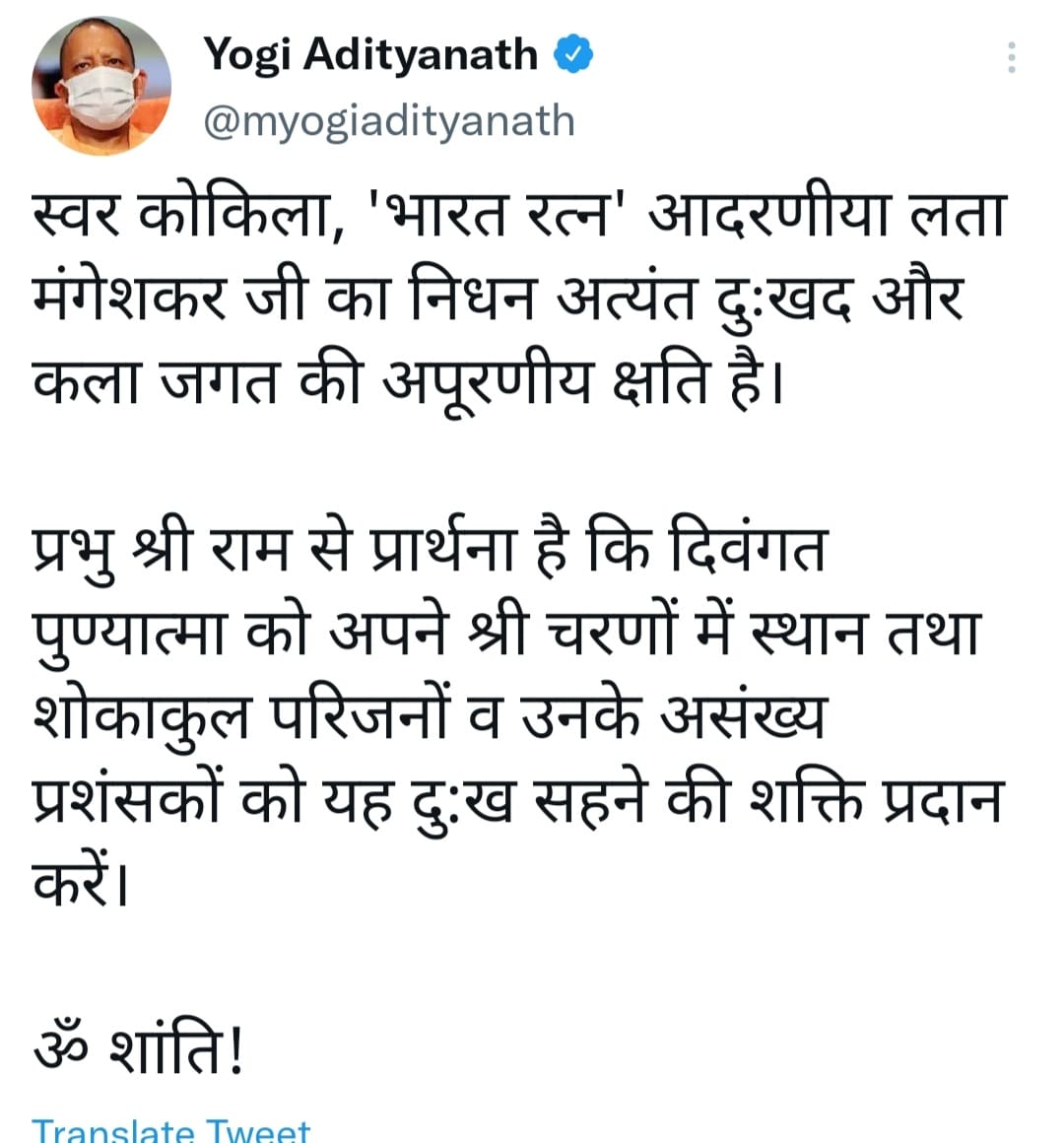 वही सीएम योगी आदित्यनाथ ने लता मंगेशकर जी के निधन पर दुःख जताया है उन्होंने ट्वीट कर लिखा स्वर कोकिला, ‘भारत रत्न’ आदरणीय लता मंगेशकर जी का निधन अत्यंत दुःखद और कला जगत की अपूरणीय क्षति है।