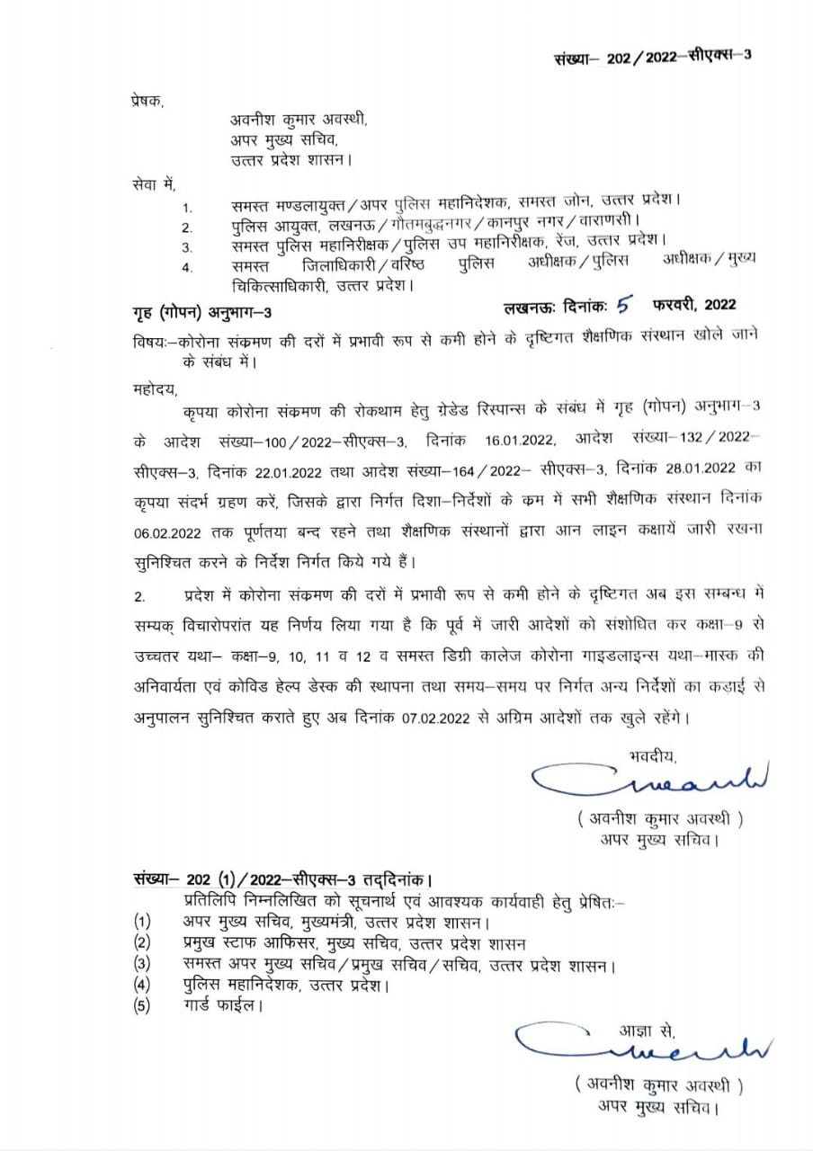 मुख्यमंत्री ने अपने गोरखपुर दौरे के दौरान 6 फरवरी के बाद स्कूल-कॉलेज खोलने के संकेत दिए थे। गौरतलब है कि हाल ही में केंद्र सरकार ने राज्य सरकारों को स्कूल-कालेज खोलने की सलाह दी थी जिसके बाद सरकार ने यह फैसला किया है। अपर मुख्य सचिव गृह अवनीश अवस्थी का कहना है कि सोमवार से स्कूल-कालेज खुल जाएंगे। आदेश जारी कर दिया गया है।