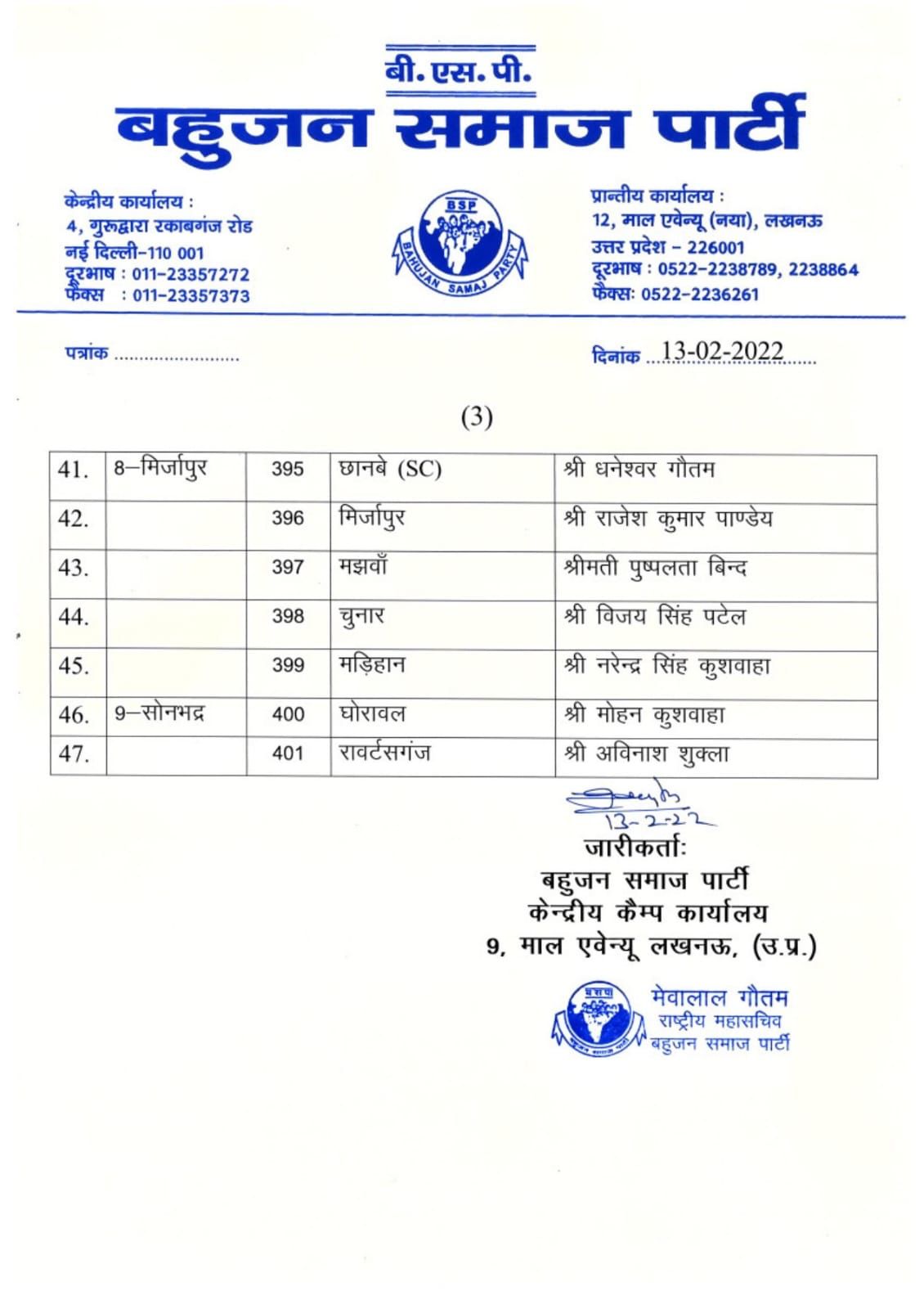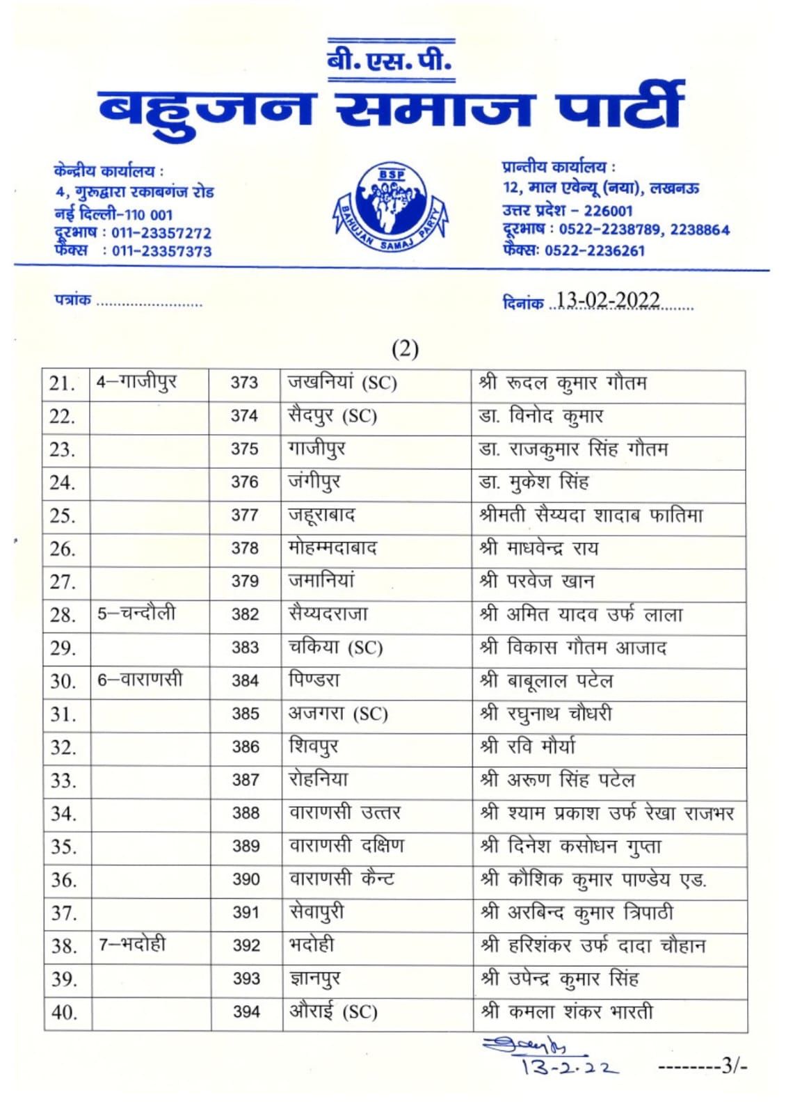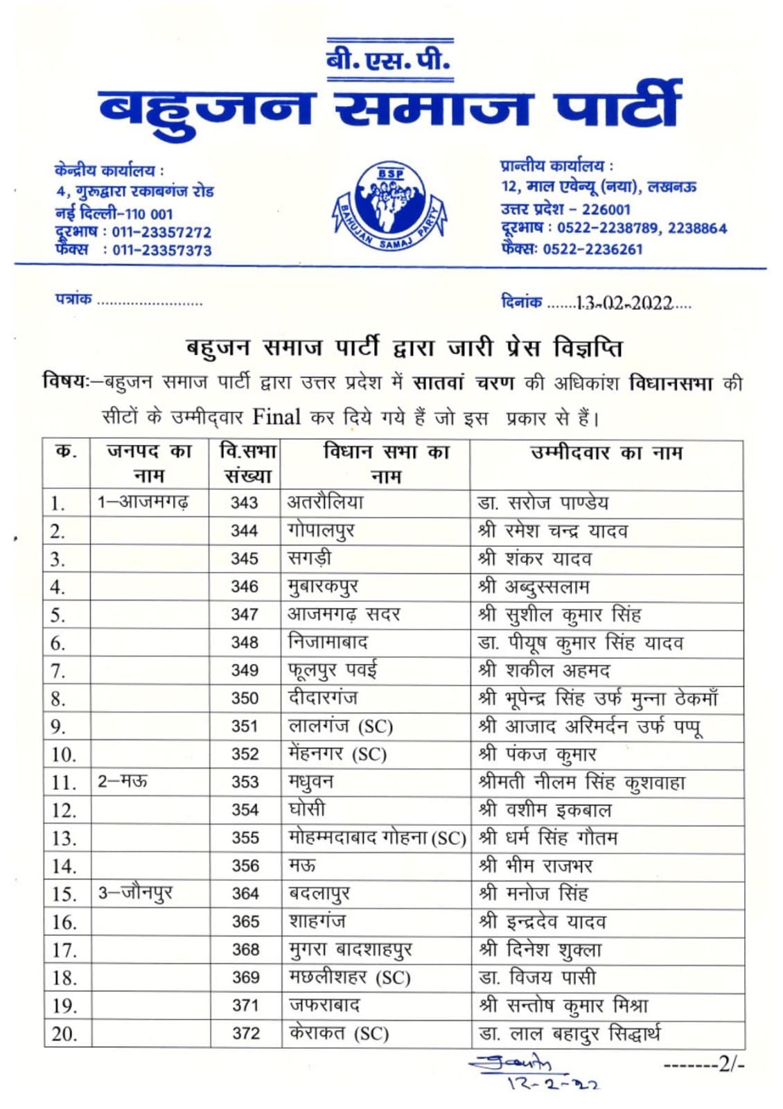 बहुजन समाज पार्टी ने रविवार को जो सूची जारी की है उसमें सातवें चरण के प्रत्याशियों ने नाम हैं। 47 प्रत्याशियों की इस सूची में गाजीपुर, मऊ, चंदौली, वाराणसी, भदोही, मिर्जापुर, सोनभद्र, आजमगढ़ तथा जौनपुर के प्रत्याशी हैं। बहुजन समाज पार्टी ने ओम प्रकाश राजभर की बड़ी घेराबंदी की है। पार्टी ने प्रगतिशील समाजवादी पार्टी के मुखिया शिवपाल सिंह यादव की खाास मानी जाने वाली पूर्व मंत्री शादाब फातिमा को गाजीपुर के जहूराबाद से प्रत्याशी बनाया है।