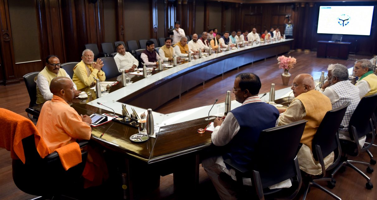 लखनऊ: यूपी चुनाव के नतीजे आने के बाद 16वें दिन योगी आदित्यनाथ ने 50 मंत्रियों और दो उपमुख्यमंत्रियों के साथ मुख्यमंत्री पद की शपथ ली तो एक बार फिर से देश के सबसे बड़े सूबे उत्तर प्रदेश में योगी शासन की शुरुआत हुई। शुक्रवार को शपथ लेने के बाद राज्य सरकार की पहली कैबिनेट बैठक शनिवार को आज होनी है। मुख्यमंत्री योगी आदित्यनाथ व नई मंत्रिमंडल गठन के बाद पहली कैबिनेट बैठक में कई बड़े फैसले हो सकते हैं। कैबिनेट बैठक दस बजे से शुरू होगी। उसके बाद साढ़े 11 बजे से मुख्यमंत्री अतिरिक्त मुख्य सचिवों, प्रधान सचिवों एवं अन्य वरिष्ठ अधिकारियों को संबोधित करेंगे।